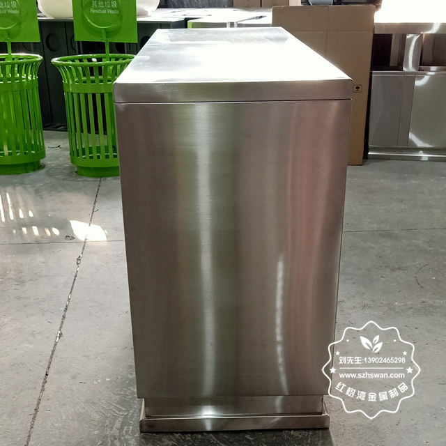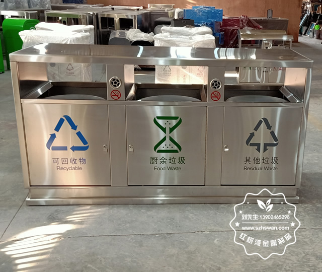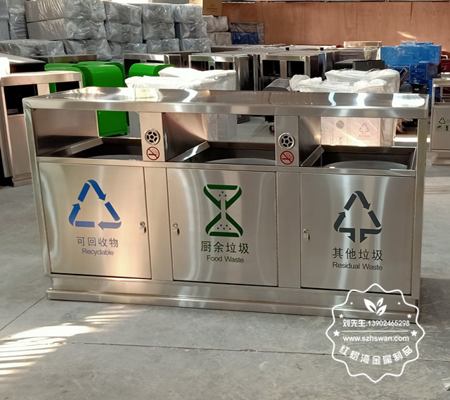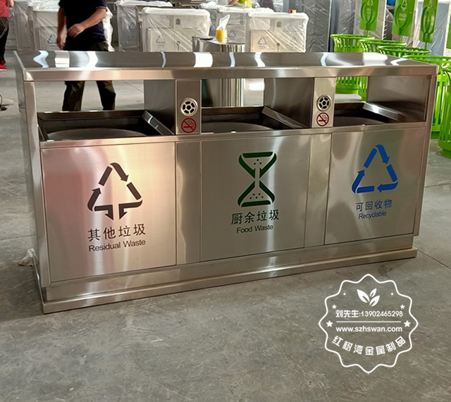 戶(hù)外方形三分類(lèi)不銹鋼垃圾箱采用優(yōu)質(zhì)201不銹鋼無(wú)縫焊接成型,投口模具沖壓成型,邊角精細(xì)打磨拋光圓滑不割手,高檔大氣。