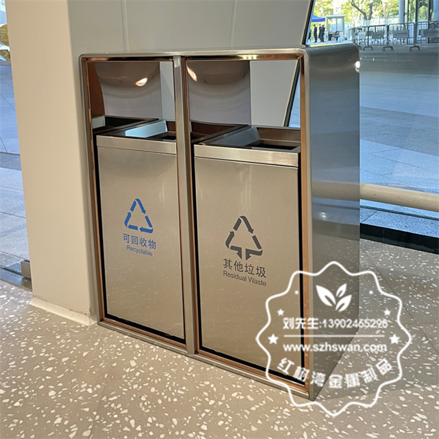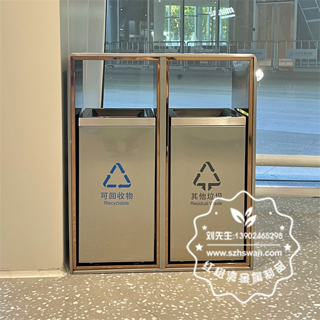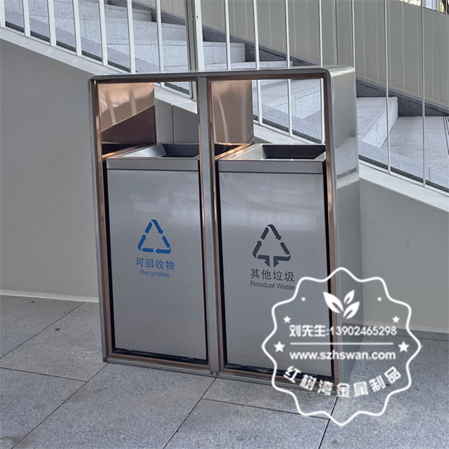 產品材質:廣場滑軌兩連體不銹鋼分類垃圾箱采用201#,202#,304#優質不銹鋼材料模壓成型,堅固耐用;內外表面光潔,減少垃圾殘留,易于清潔;配置鍍鋅板內桶,便于垃圾清倒;