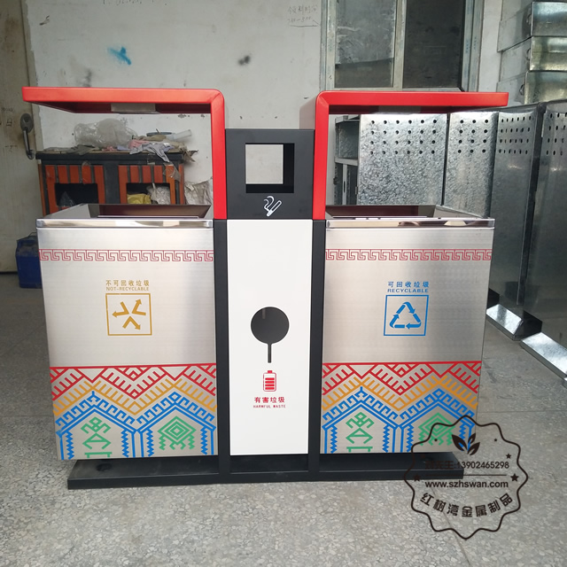 產品材質:創意UV打印戶外分類不銹鋼垃圾桶采用201#,202#,304#優質不銹鋼材料模壓成型,堅固耐用;內外表面光潔,減少垃圾殘留,易于清潔;配置鍍鋅板內桶,便于垃圾清倒;