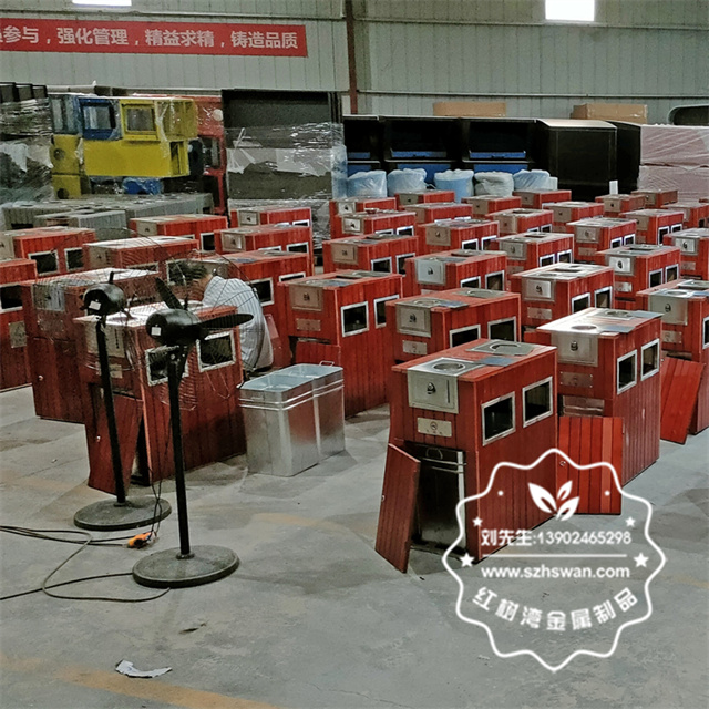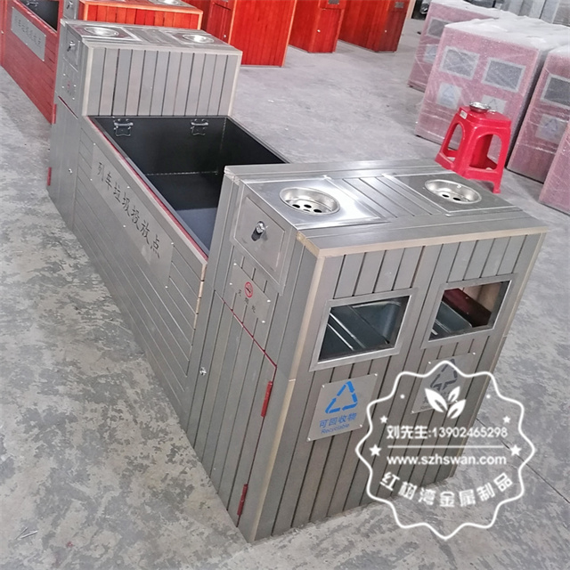 產品材質:高鐵站環衛連體組合鋼木分類垃圾桶鋼木部分可選用優質進口山樟木、防腐木或塑木,經防腐烘干處理后加工成型。桶身框架采用冷軋鋼板加工,表面經酸洗磷化噴塑處理組裝而成,使其戶外耐候持久,防腐防蛀不變形等優點;