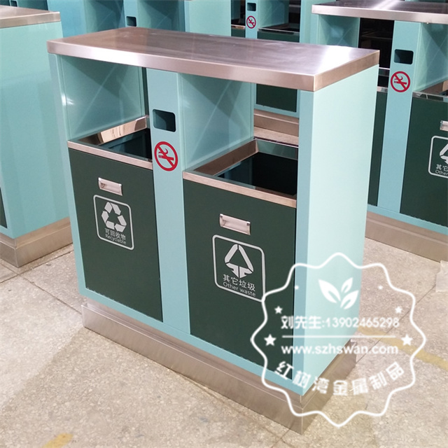 景區不銹鋼多分類垃圾桶:這一款戶外垃圾桶選用優質不銹鋼板裁剪、壓制、折彎后再焊接而成型;頂部弧度設計,桶身精致拉手,頂部設置煙灰缸,加厚雙層底座垃圾箱上,正面釘著一塊宣傳牌:“講衛生,愛清潔,垃圾入箱。"白底紅字,十分醒目。