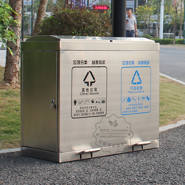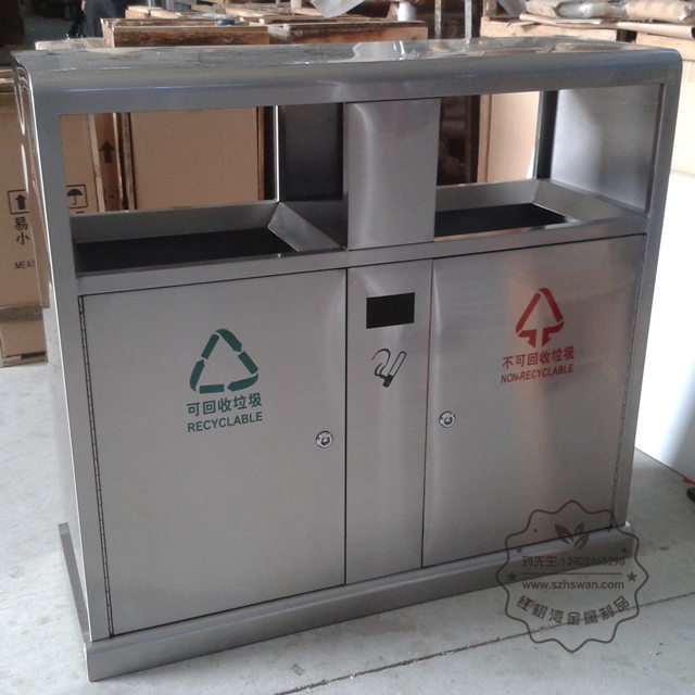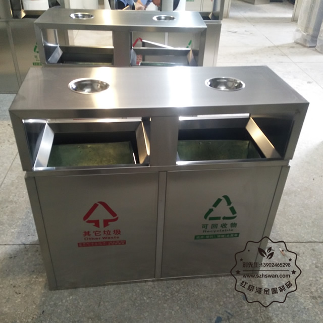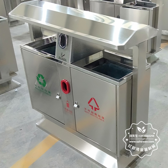 雙桶兩分類不銹鋼果皮箱有室內和戶外,今天深圳市紅樹灣金屬制品有限公司的小編介紹介紹雙桶不銹鋼果皮箱,說起不銹鋼大家都不陌生,因為我們家里面的鍋碗調盆、桌子椅子、門窗很多都是采用不銹鋼材質制造的,不銹鋼是一種耐腐蝕、防火、等優點的金屬材質,304型號的不銹鋼更是食品級的材質很多西餐廳的叉子、菜刀能接觸食物材質很多都是304不銹鋼制作的,我們生活中的不銹鋼果皮箱就很多是201不銹鋼材質的,其實生活垃圾容器使用201就已經很奢侈了,而且很多材質都是塑料、鋼制、玻璃鋼等等材質的容器,不銹鋼材質在這幾種材質里面算是比較好的,也有部分的廢物容器是304不銹鋼的,201不銹鋼垃圾桶和304不銹鋼垃圾桶我們用肉眼是分別不出的,需要專業人生和工具才能夠辨認出來,下面小編就發一下我們廠家生產過的不銹鋼雙桶果皮箱。