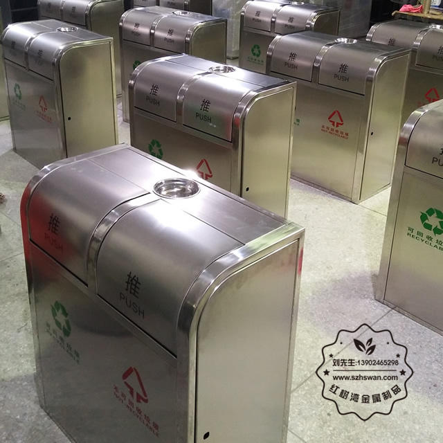 這款雙筒不銹鋼垃圾桶型號(hào)為C183,尺寸規(guī)格:800*450*850mm,1個(gè)600元、50個(gè)550元、100個(gè)500元,左右兩邊側(cè)面開(kāi)門(mén)可以取出內(nèi)筒,環(huán)保果皮箱兩分類(lèi)搖蓋式方形設(shè)計(jì),頂部中心位置帶一個(gè)煙灰盅,垃圾箱正面絲印了可回收垃圾、不可回收垃圾,桶蓋絲網(wǎng)印刷一個(gè)推字,是我們紅樹(shù)灣金屬制品熱銷(xiāo)的一款產(chǎn)品。