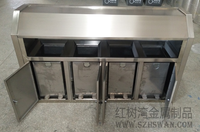 這款不銹鋼四分類垃圾桶是全身采用304#不銹鋼材質(zhì)制作的,垃圾箱體積較大制作拋光工藝和焊接工藝比較復(fù)雜;垃圾桶頂部仿屋形有四個絲印分別為可回收垃圾箱、其他垃圾箱、餐廚垃圾箱、有毒垃圾箱,正面有四個門方便環(huán)衛(wèi)工人清理垃圾箱的廢物。