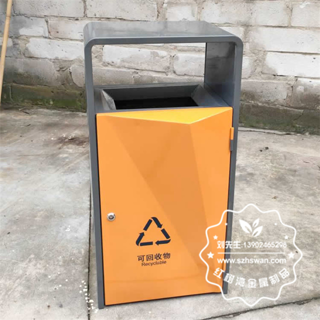 深圳寶安學校菱形不銹鋼分類垃圾桶可以選用不銹鋼板、冷軋鋼板、鍍鋅鐵板制作,型號:F435,尺寸規格:450*350*900mm,方形單桶組合式設計,框架表面噴塑烤漆灰色,橘黃色和綠色門板菱形設計,淺灰色平面門板,門板可以絲印分類標識及企業logo,可以使用三角鑰匙開門取出內筒。